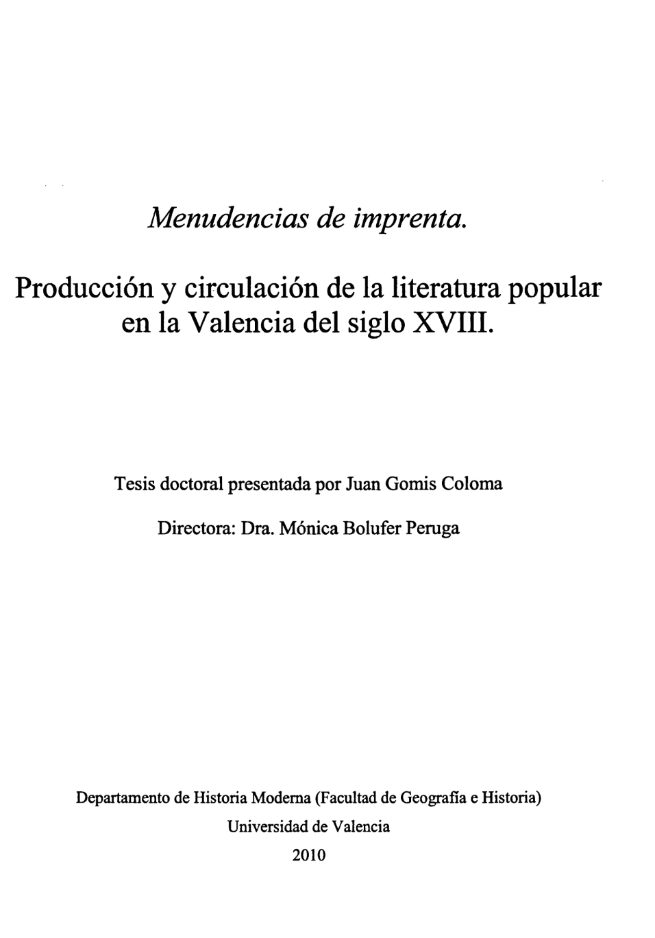 Gomis Coloma, Juan, Menudencias de la imprenta. Producción y circulación de la literatura popular en la Valencia del siglo XVIII, tesis doctoral, Universidad de Valencia, 2010.