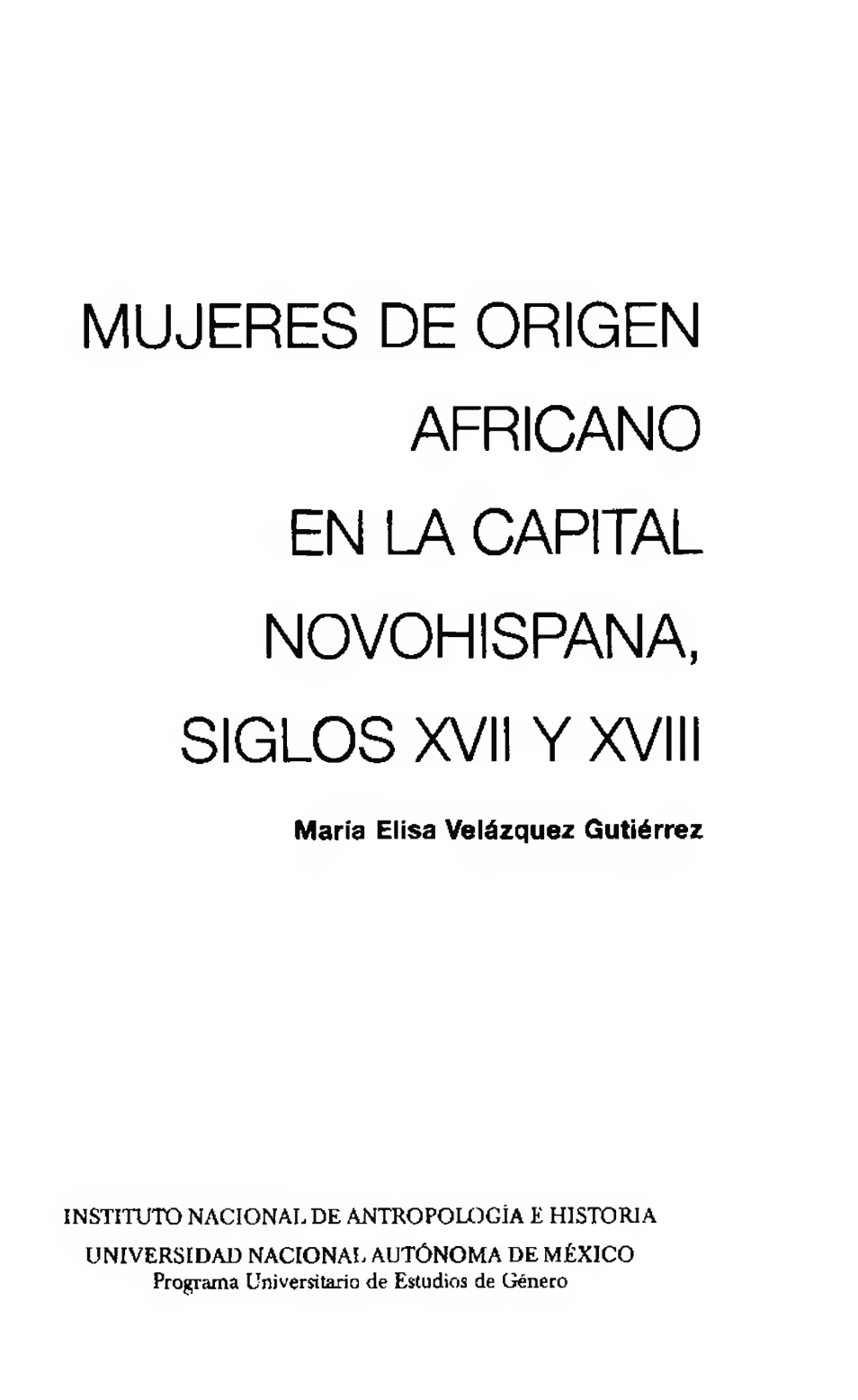 Velázquez Gutiérrez, María Elisa, Mujeres de origen africano en la capital novohispana, siglos XVII y XVIII, México: UNAM / INAH, 2006.
